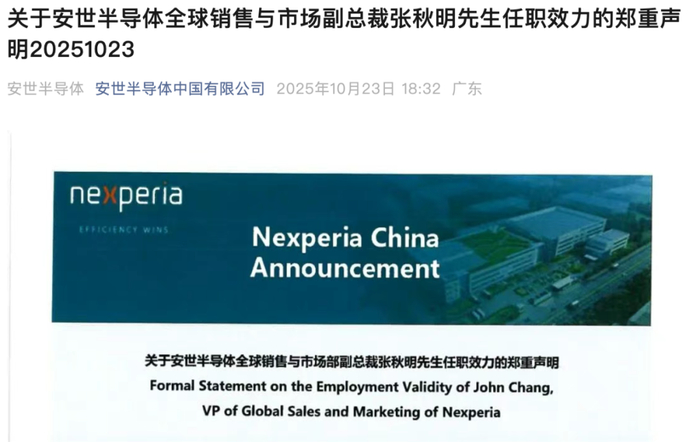 10月23日晚,安世半导体中国有限公司发布关于安世半导体全球销售与市场副总裁张秋明先生任职效力的郑重声明。