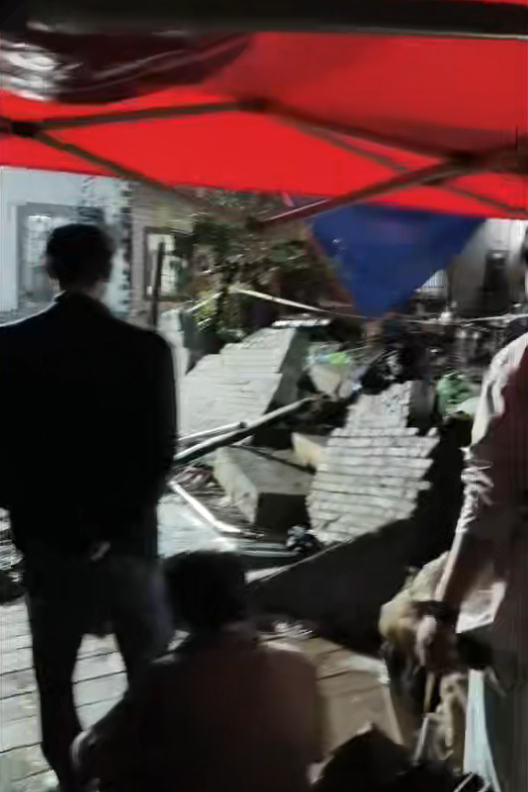 “篷布的一侧用绳索绑在墙上固定,但那个篷布没有做好排水,雨水都积在了篷布顶上。”该村民告诉记者,因篷布上积水太多,围墙难承其重,被绳索拉倒,砸向了下方参加葬礼的人群。
